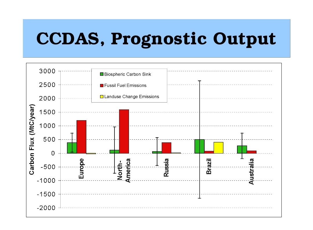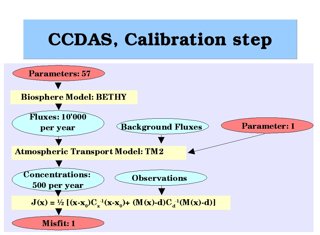 The goal of Carbon Cycle Data Assimilation is to derive a consistent picture of the carbon cycle by combining numerical models with the various streams of observational data that are becoming available. As the atmosphere integrates carbon dioxide exchange fluxes with the other components of the Earth system, atmospheric transport plays a central role. Our Carbon Cycle Data Assimilation activities are thus a natural extension of our work on atmospheric transport inversions. What we sketch below is joined work with our partners in the Carbon Cycle Data Assimilation System (CCDAS) (Consortium)